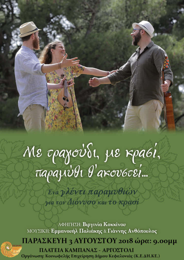 Η ΚΕΔΗΚΕ σας προσκαλεί σ’ένα μουσικοαφηγηματικό ταξίδι στο πλαίσιο των εκδηλώσεων για την προβολή των κεφαλονίτικων κρασιών στην πλατεία Καμπάνας στο Αργοστόλι την Παρασκευή 3 Αυγούστου στις 8.30μμ.