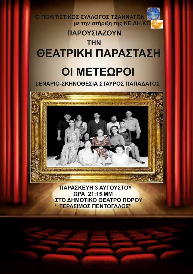 Την Παρασκευή 3 Αυγούστου στο Αμφιθέατρο «Γεράσιμος Πεντόγαλος» στον Πόρο, στις 9.00μμ. ο Πολιτιστικός Σύλλογος Τζαννάτων & η Κ.Ε.ΔΗ.ΚΕ. παρουσιάζουν την Θεατρική παράσταση «Οι Μετέωροι», σε σενάριο & σκηνοθεσία του Σταύρου Παπαδάτου. Τους ρόλους ερμηνεύουν ερασιτέχνες ηθοποιοί από την ευρύτερη περιοχή Ελειού Πρόνων. Η Είσοδος είναι ελεύθερη.