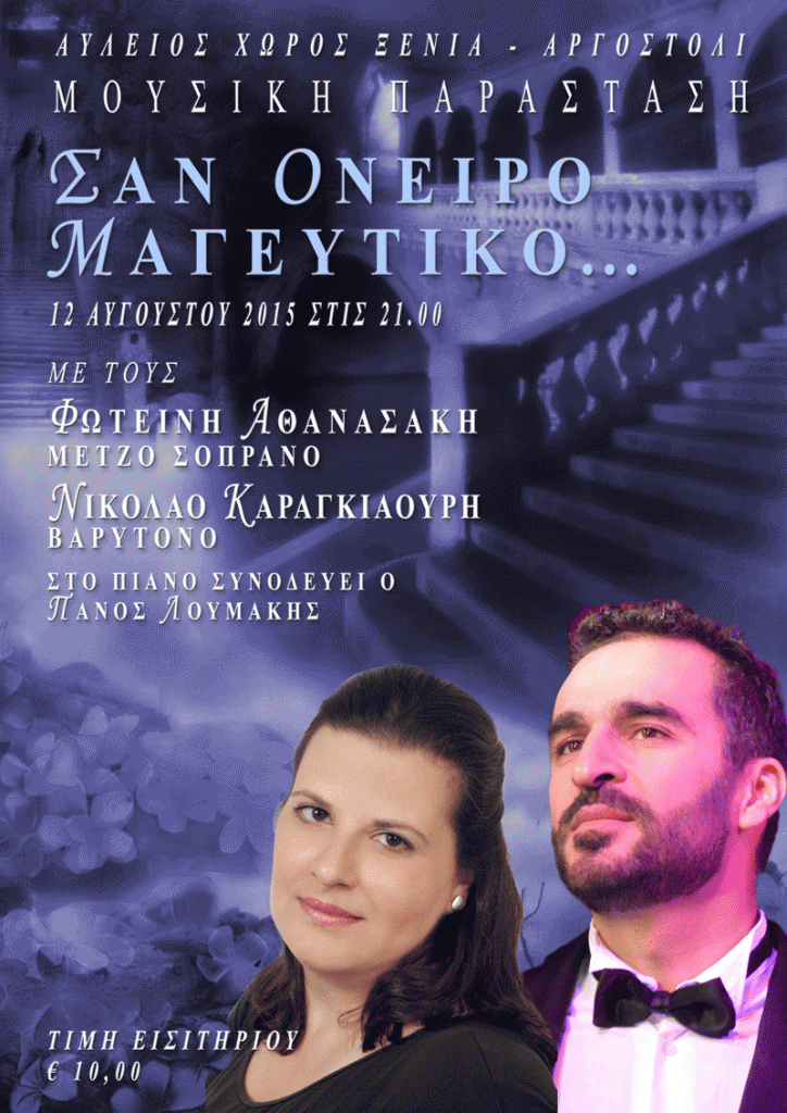 Η Κ.Ε.ΔΗ.ΚΕ & Η ALTERCOM παρουσιάζουν την Μουσική Παράσταση «ΣΑΝ ΟΝΕΙΡΟ ΜΑΓΕΥΤΙΚΟ», στον Αύλειο Χώρο Ξενία, στο Αργοστόλι στις 12 Αυγούστου 2015.