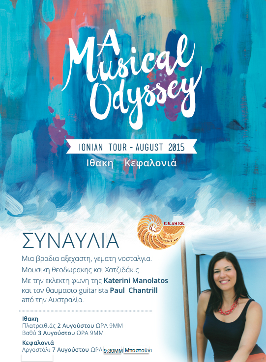 Την Παρασκευή 7 Αυγούστου στο Μπαστούνι Αργοστολίου στις 9.00μμ. η Κοινωφελής Επιχείρηση Δήμου Κεφαλονιάς διοργανώνει συναυλία Αφιέρωμα στα 90 χρόνια του Μίκη Θεοδωράκη με την υπέροχη φωνή της Katerini Manolatos. Μαζί της ο κιθαρίστας Paul Chantrill.