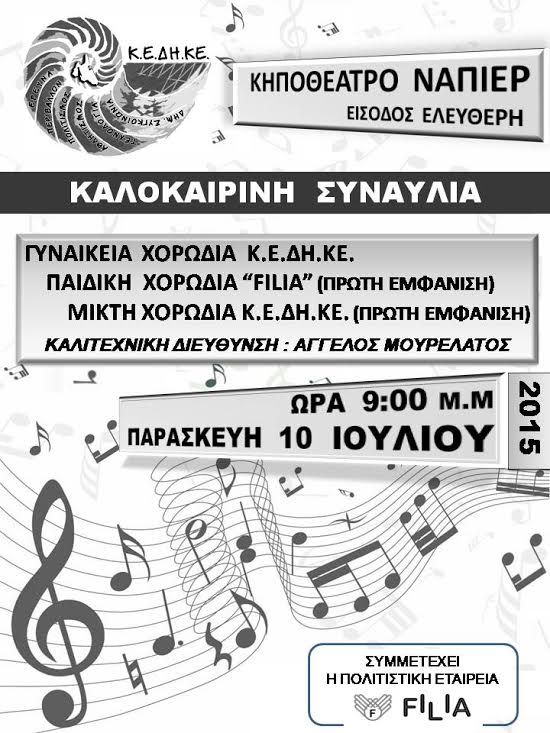 Έτσι λοιπόν, την Παρασκευή 10 Ιουλίου στο Αργοστόλι στο κηποθέατρο Νάπιερ, και ώρα 9.00μμ θα πραγματοποιηθεί Συναυλία με τραγούδια Ελλήνων Συνθετών, με τα Χορωδιακά Σχήματα Αργοστολίου της Κ.Ε.ΔΗ.ΚΕ. Λαμβάνουν μέρος η Γυναικεία Χορωδία & η Μικτή Χορωδία της Κ.Ε.ΔΗ.ΚΕ. στην πρώτη της εμφάνιση καθώς επίσης και η Παιδική χορωδία της FILIA επίσης σε πρώτη εμφάνιση. Τις χορωδίες θα συνοδεύουν στο πιάνο η Ευαγγελία Φραγκιά & σε φιλική συμμετοχή ο Γρηγόρης Βλαχούλης.