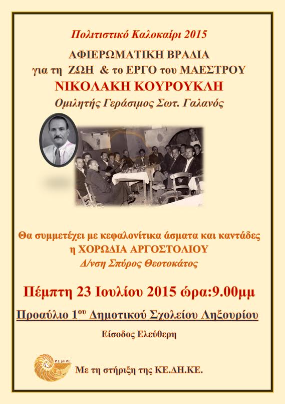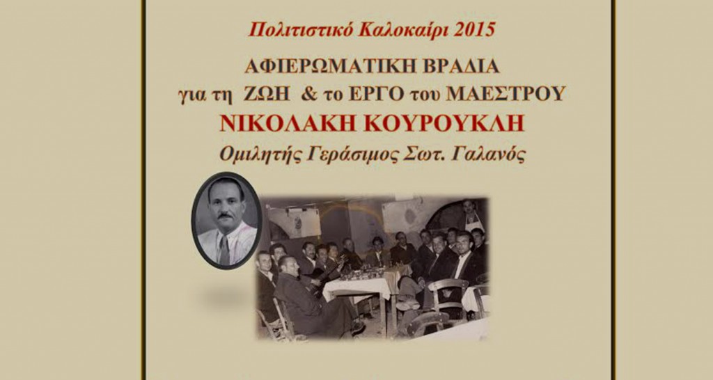Αφιερωματική Βραδιά για τη ζωή και το έργο του μαέστρου Νικολάκη Κουρούκλη. Ομιλητής Γεράσιμος Σωτ. Γαλανός.